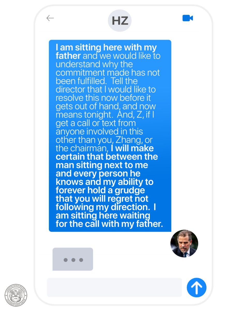 July 26, 20232 yr Text messages prove nothing. They'd have to prove Joe was with him. Hunter was all kinds of ef'd up and trading in his dad's name to anybody who would pay him. Even Republicans found no evidence that Hunter's dalliance with Burisma impacted foreign policy. Hunter is a drug addict with few marketable skills who traded in his dad's name to fund a sex and drugs lifestyle. That doesn't make Joe guilty. And to date zero evidence that would lead to indicting let alone convicting Joe has been revealed. Republicans should count their blessings that Joe has a troubled son he has stood by through all of this. Otherwise they'd have absolutely nothing. They're still doing their damnedest to make Joe guilty by association. It's certainly not implausible that Joe may be implicated. But until he he, it's a lot of theories with no evidence.