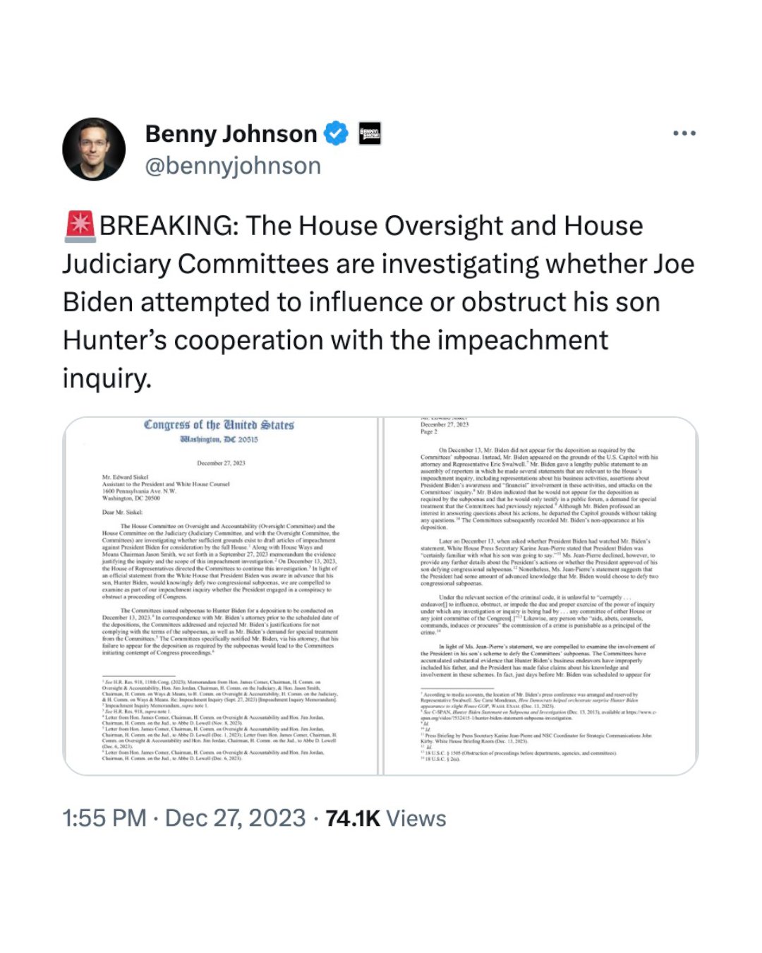 December 28, 20231 yr So let me get this straight. Republicans cooked up impeachment charges against Joe Biden, so they could add more charges for influencing Hunter? With no evidence?