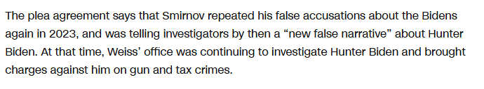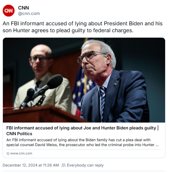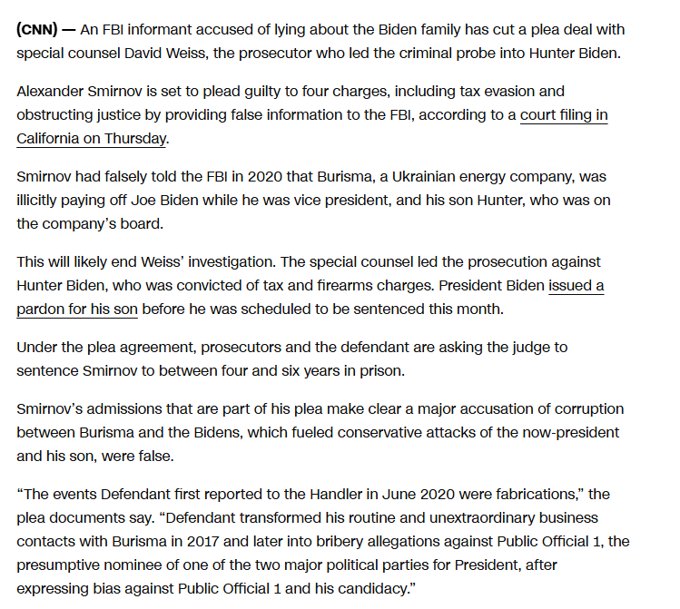December 12, 2024Dec 12 FBI informant pleads guilty and admits he made up the Burisma-Biden story. Quote As part of the plea deal with Justice Department special counsel David Weiss, Alexander Smirnov will admit he fabricated that the story that became central to the Republican impeachment inquiry in Congress.