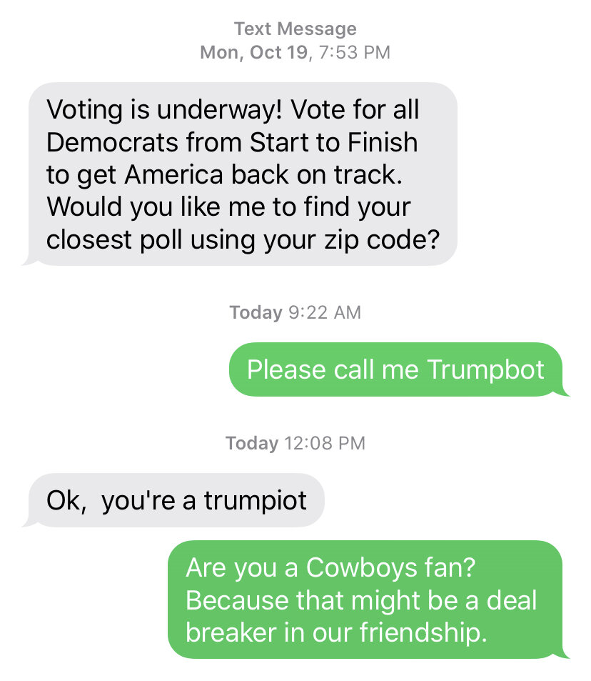 October 26, 20204 yr Between now and election day I’m replying to every political text with "please call me Trumpbot.”