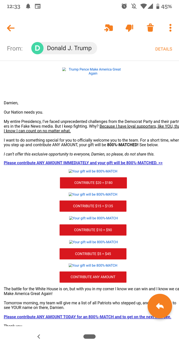 October 26, 20204 yr 17 hours ago, Bwestbrook36 said: I get freaking emails from team trump with no way to unsubscribe!! Why are you guys getting cool texts!! Mitch McConnell got my work email somehow.