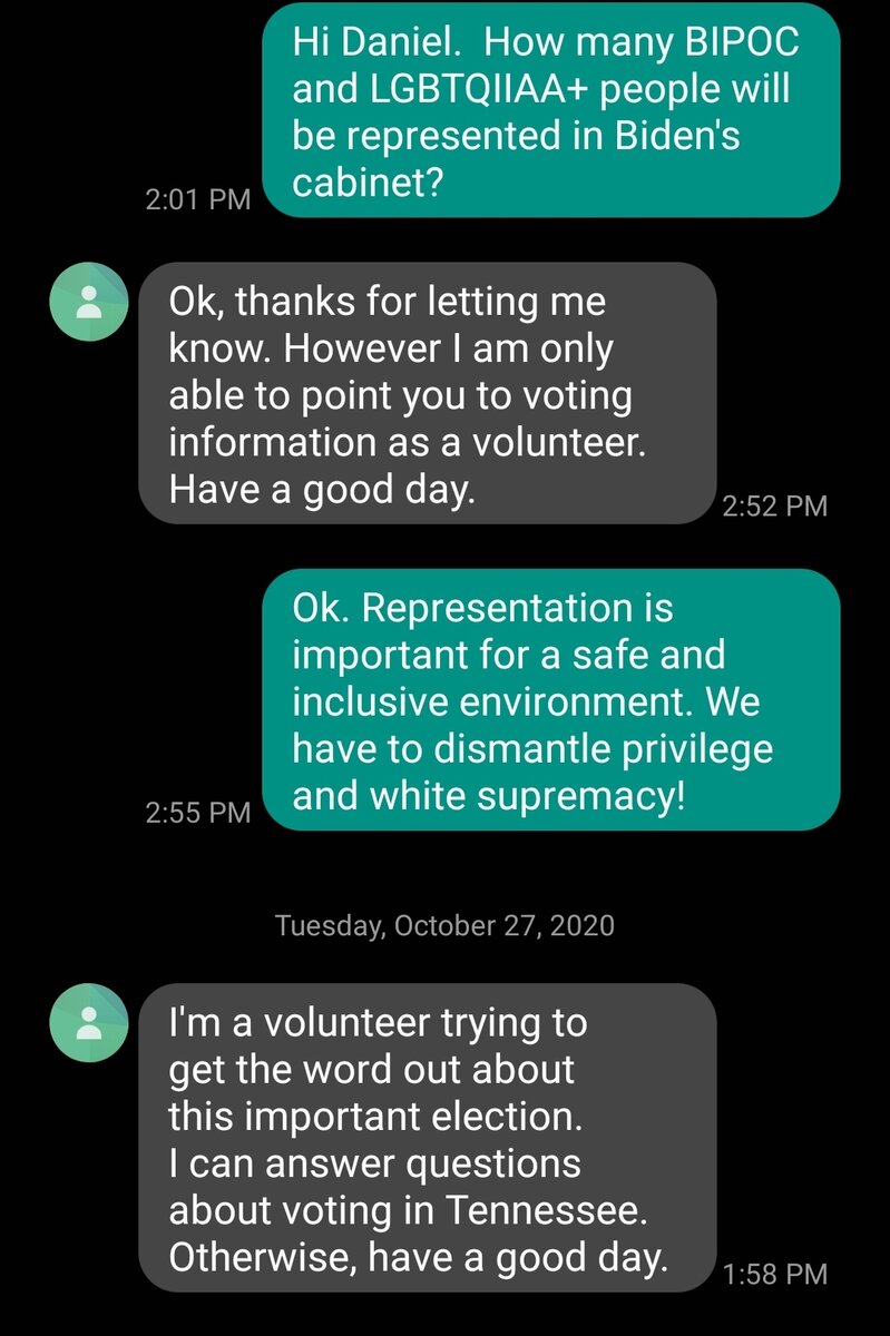 November 2, 20204 yr I’m still getting about 4 a day. I decided to mess with one who was a Biden supporter. So I responded that I voted for Jo. The person said they were very glad to hear that. I asked if they think that Jo has a chance, being the third party and all. They responded that they were sorry, thinking I meant Joe instead of Jo.