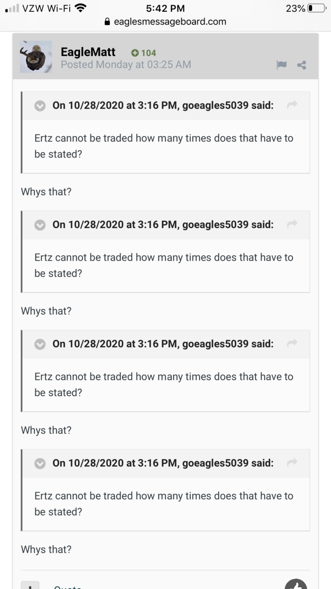 November 2, 20204 yr On 10/28/2020 at 3:16 PM, goeagles5039 said: Ertz cannot be traded how many times does that have to be stated? Whys that? On 10/28/2020 at 3:16 PM, goeagles5039 said: Ertz cannot be traded how many times does that have to be stated? Whys that? On 10/28/2020 at 3:16 PM, goeagles5039 said: Ertz cannot be traded how many times does that have to be stated? Whys that? On 10/28/2020 at 3:16 PM, goeagles5039 said: Ertz cannot be traded how many times does that have to be stated? Whys that?