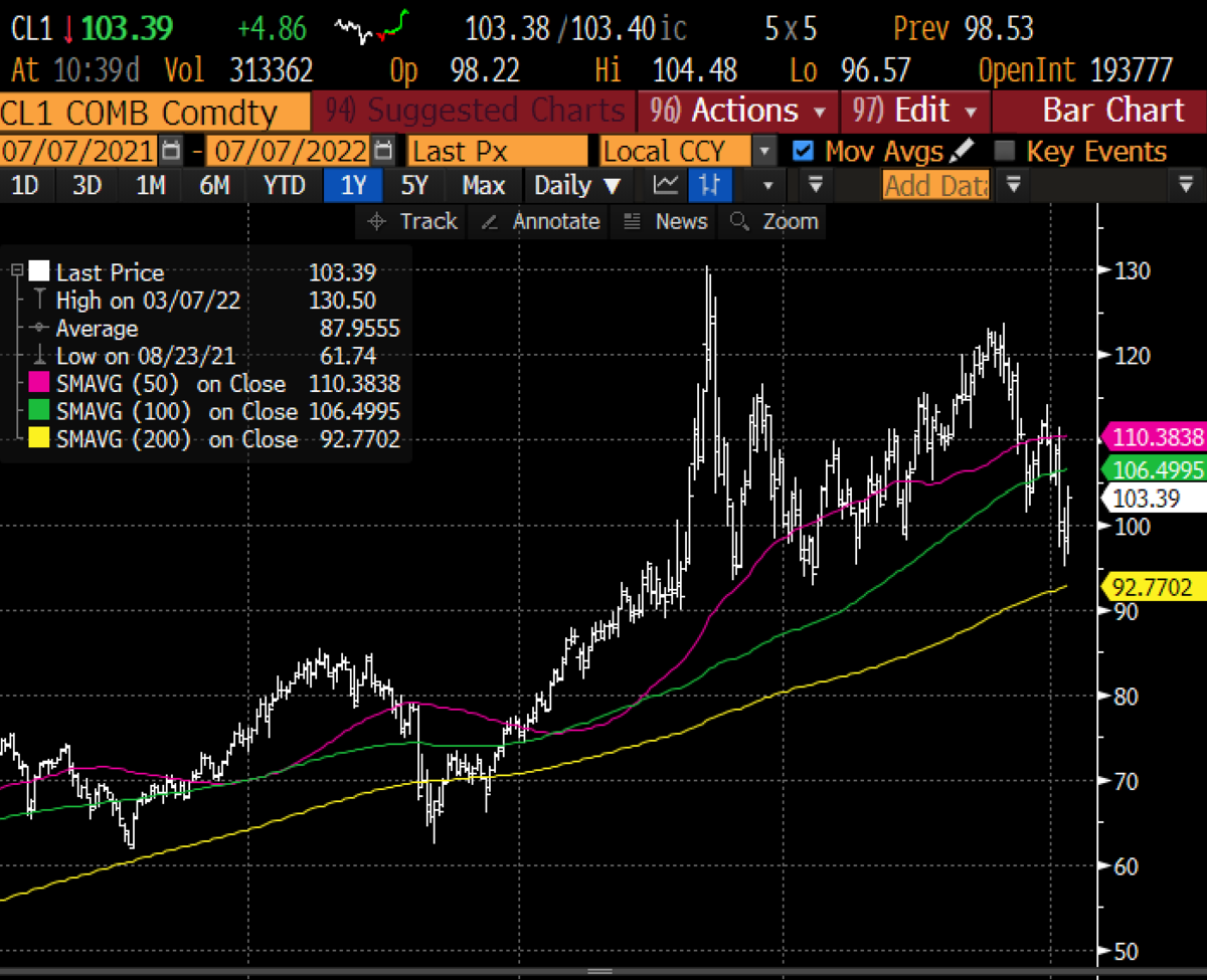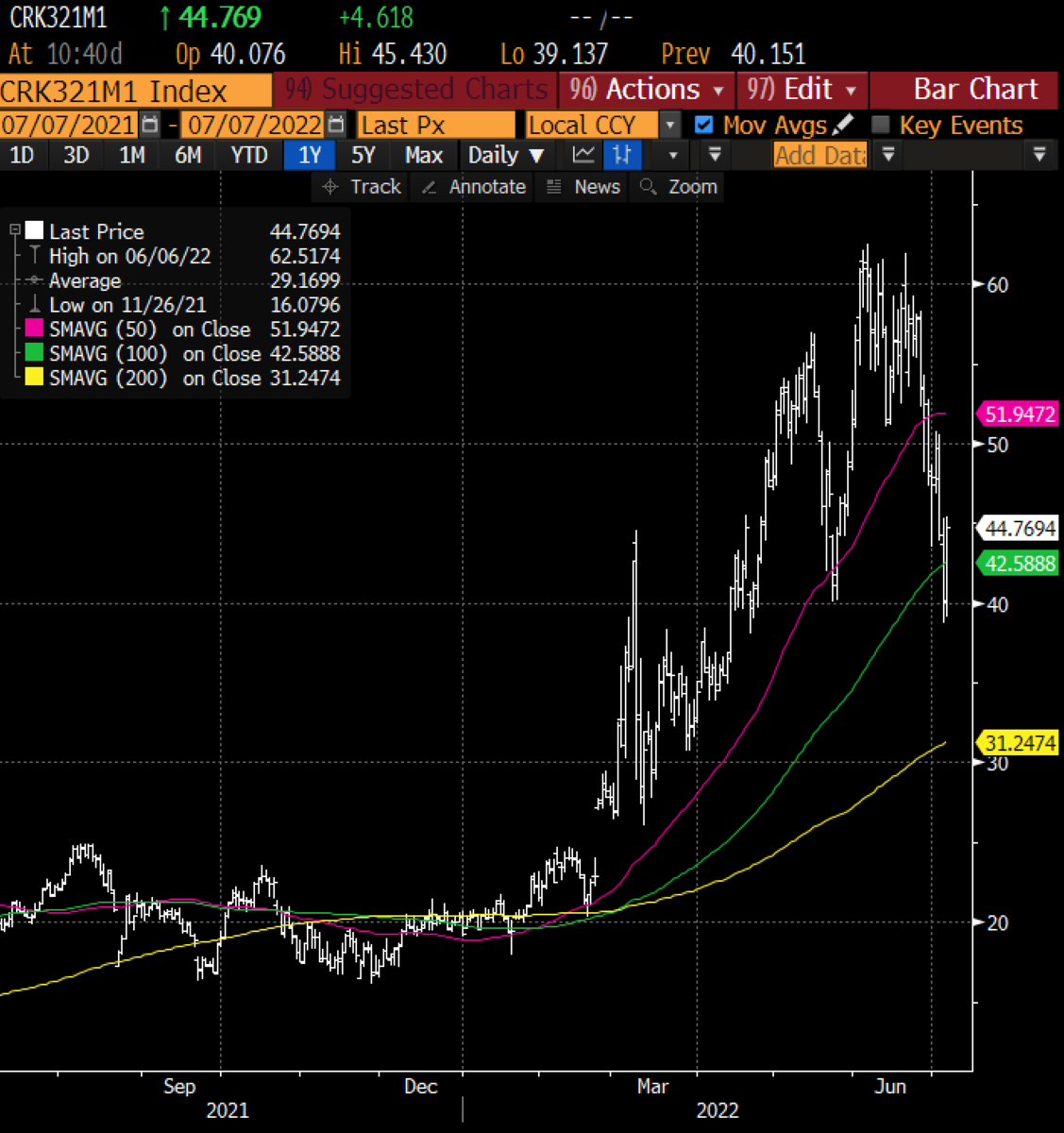 July 7, 20223 yr 1 minute ago, JohnSnowsHair said: Crude price drops usually lead pump price drops by quite a bit though do they not? And are you saying futures were actually expecting sustained inflation in the 7-8% range? That seems ... dumb. At the peak, 2 year inflation expectations were 5%. Which is bananas. The reason for the quick reaction is the drop in crack spreads. That's the profit margin over the crude price for refiners. Usually when crude drops, prices drop slowly and crack spreads increase -- it's been the opposite this time. That's coming from speculation in gasoline and expected demand destruction -- the supply is unchanged or even a little higher, and the summer demand just isn't there. Basically, everyone leaned one way starting in late March, and now they've all been caught.