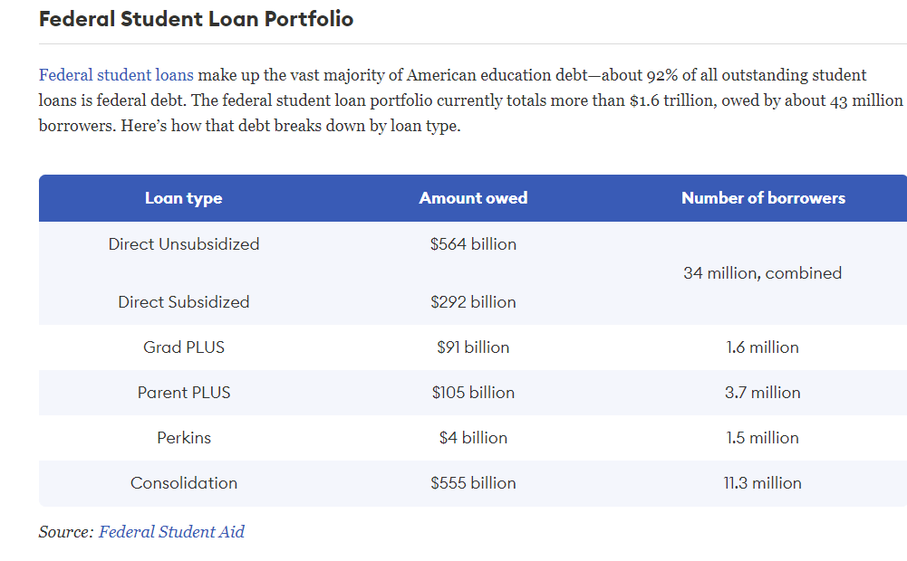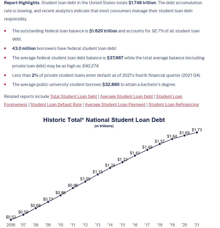 August 26, 20223 yr Author 1 hour ago, vikas83 said: 1) The loans aren't from for-profit enterprises. They are from the federal government. ~93% of existing student loan debt is owed to the federal government, and basically all new loan originations since 2010 are from the Feds. Stop with the predatory lender boogyman -- the guy screwing people is the federal government that morons think will save them Again, these numbers just astound me. To my knowledge, a lot of people have student debt hanging around from over 15-20 years ago and owe much to private lenders or their servicers. Maybe that's the 7%, but that's actually incredible to me because it would mean that most of the student loans from over a decade ago have been paid off. Is that accurate? Is the 1.8T, or whatever the student debt level currently is, debt that has mostly been accrued over the last 12-15 years?