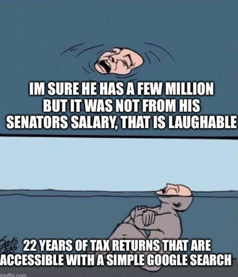 September 22, 20223 yr 34 minutes ago, Mike31mt said: Im sure he has a few million but it was not from his senators salary, that is laughable Now go re-read my posts and pretend you understand my point from the beginning Lol yeah please explain it to me in detail
