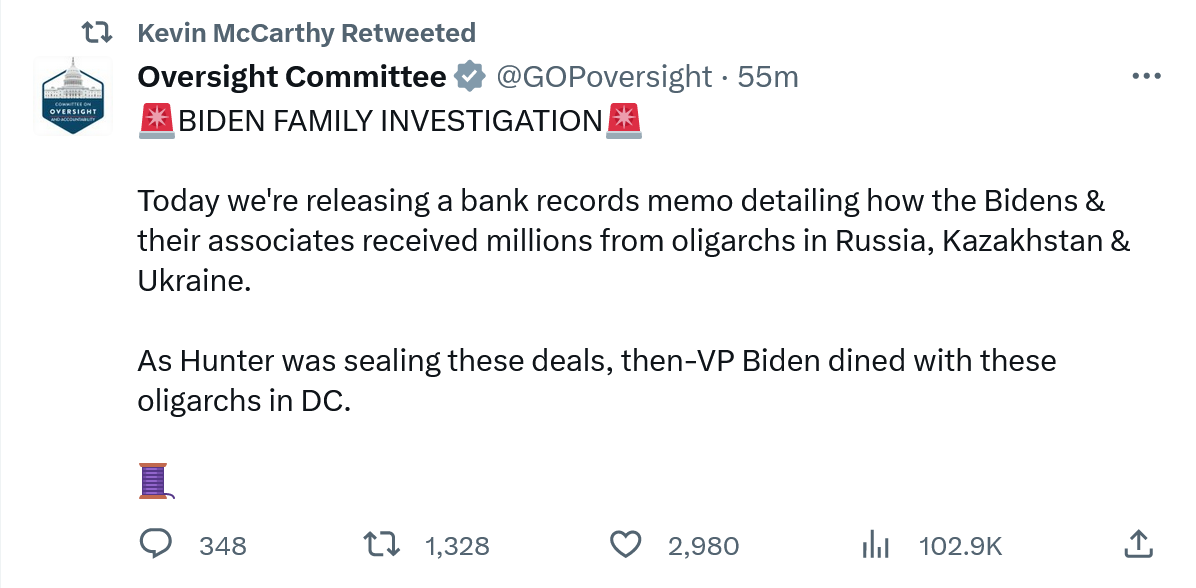 August 9, 20232 yr https://oversight.house.gov/release/comer-releases-third-bank-memo-detailing-payments-to-the-bidens-from-russia-kazakhstan-and-ukraine/ Comer Releases Third Bank Memo Detailing Payments to the Bidens from Russia, Kazakhstan, and Ukraine