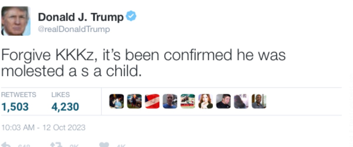 October 12, 20232 yr 2 minutes ago, Kz! said: This is one of my favorite new TDS fanfic stories. Honestly, it's kind of hard to tell when your serious and when you're just pretending to be the world's most gullible libtard. What helps his defense is that this lady who clearly is mentally unwell waited over twenty years to report the rape and when she did come forward she wrote an article about it. What helps his defense is that she also came forward with allegations about another twenty-year-old high-profile rape, but didn't pursue charges because Les Moonves "simply denied it” and "he didn’t call me any names." What helps his case is that the described encounter was literally the plot of a Law and Order episode. Oh, and also, you completely suck at accurately recounting your libtard TDS folklore anyway because: "On the issue of rape, the jury found that Carroll did not prove that Trump had raped her." But, again, not sure you're entirely serious about this one or if you're being genuine in your belief that Donald Trump is a serial rapist. When you're as addled with TDS and mental illness as you clearly are, you probably can't even coherently convey your actual beliefs and you instead get caught up playing this weird caricature of a braindead sheetlib. How can one man pack so many excuses for rape into one post? Trump couldn't be rapist because...A lAW n OrDerr EpISood! He raped her. She told a bunch of people about it at the time. They testified under oath. He was found liable for sexual assault. Trump sued for defamation. The judge ruled that he could be categorized as a rapist (since, you know, he raped somebody ).