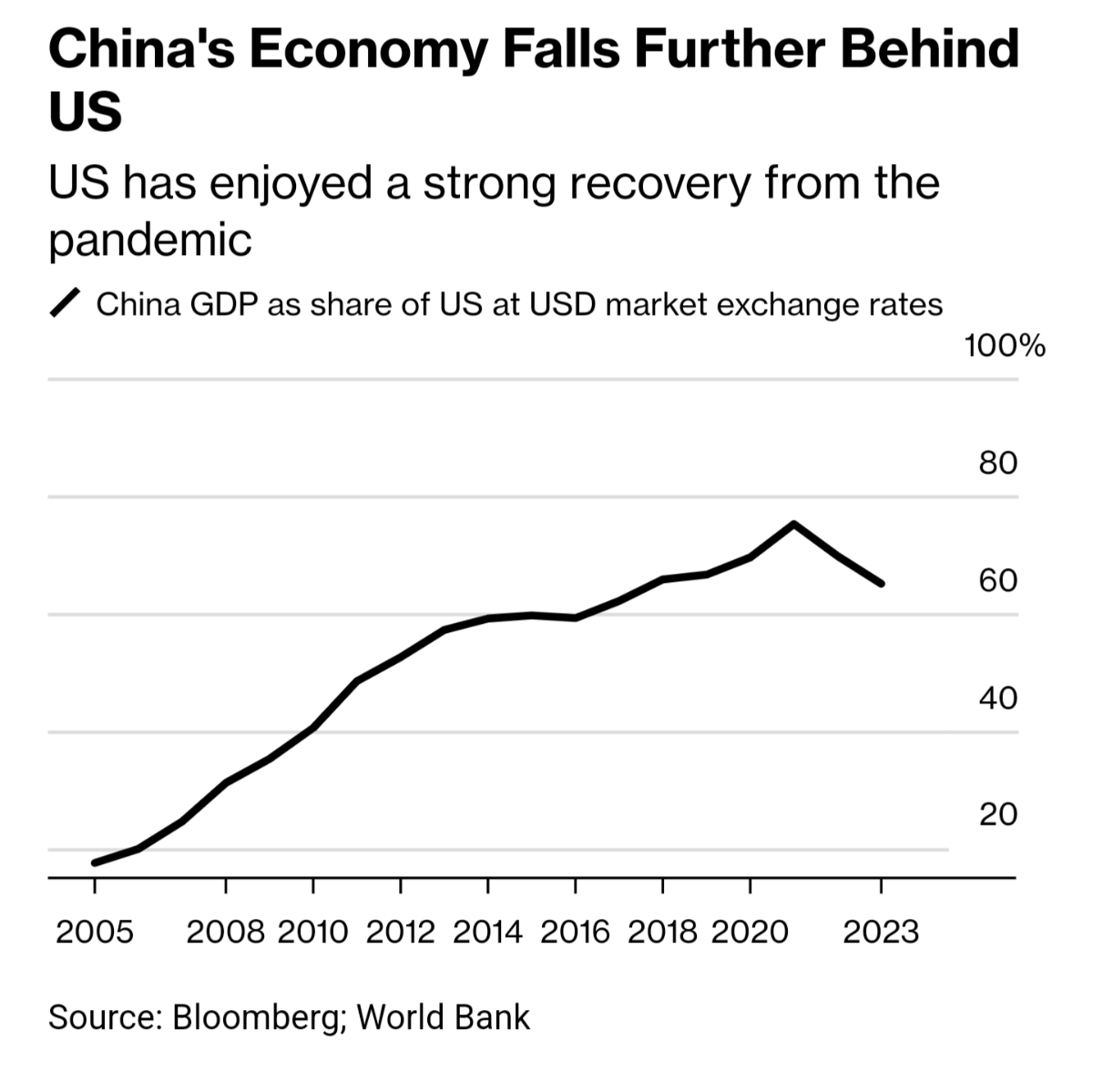 March 31, 20241 yr https://www.bloomberg.com/news/newsletters/2024-01-26/global-economy-latest-us-and-china-battle-for-top-economy?embedded-checkout=true "Despite 2023 opening with widespread expectations of a recession, it ended with US gross domestic product rising by some $1.6 trillion for the year, official data showed on Thursday. That’s a little less than Korean GDP for 2022, according to data compiled by Bloomberg. The growth rate — unadjusted for inflation — clocked 6.3%, outstripping China’s 4.6% pace. Some of the outperformance was of course due to the faster pace of consumer-price increases in the US compared with China, which has hit a patch of deflation."