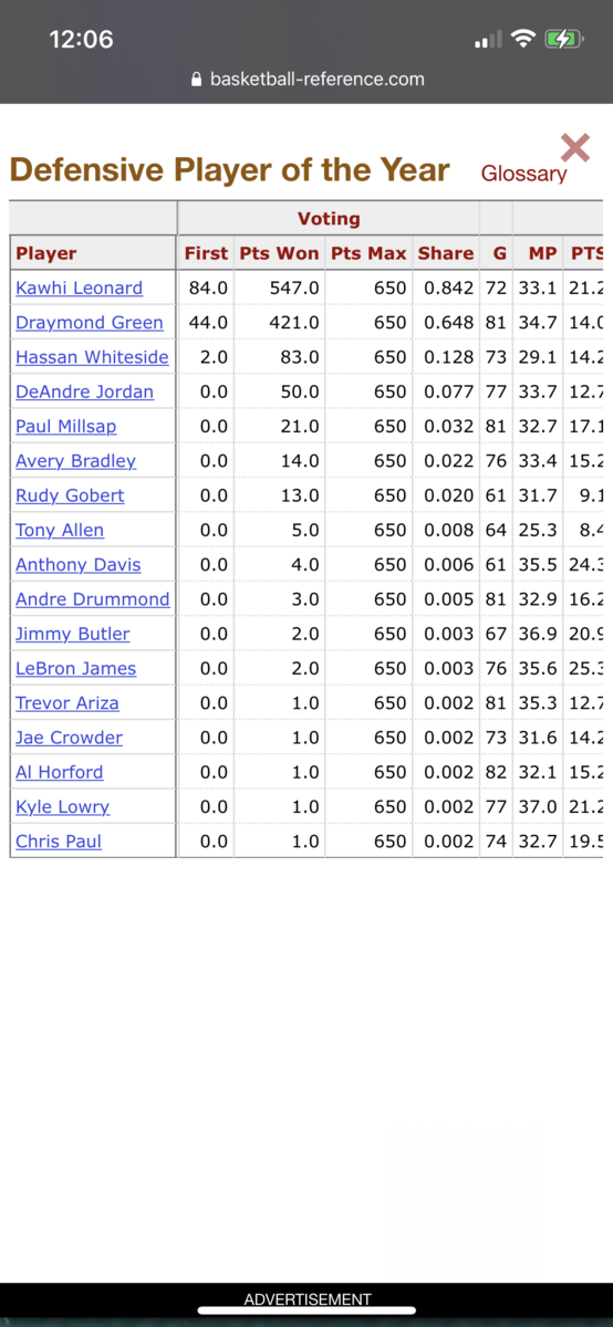 May 17, 20214 yr Author 1 hour ago, Bwestbrook36 said: I don't know, still don't think he should of been in. He was a great defender for 4-5 years and a good rebounder for 2 seasons. Just think you should.be great to elite for longer then that. 4x defensive player of the year is huge. I just pulled up Draymond as a similar defensive comp. The year before Dray won, he got 2nd overall (with the most 1st place votes) in a year where Kawhi won (while missing something like 18 games aka basically 25% of the season). Kawhi was already a finals MVP and was a known player. Draymond got the starting role over David Lee that season, which was about the only reason casual bball fans probably knew his name as that was discussed quite a bit during the year. GSW won their first finals, which nobody was certain of, and even on a 67-15 season that was talked about a ton, it was all Kerr-Curry-Klay offensive attention. So Draymond IMO should have been the winner 14-15 and won in 16-17, but this 14-15/15-16 2nd place finished don’t show up on these career accolades pages. His steals leader would match Wallace’s blocks leader. X-ray doesn’t have 2x rebounds but he’s finished seasons for league assists in: 4th, 13th, 7th, 9th, 7th. That’s 5 stellar years for a PF/C hybrid, which has to be equivalent to a big dude like Wallace being tops in rebounds. I know it’s kind of been a general belief that Dray will likely make HOF (which it’s for all basketball, not just NBA, and he had great college accolades and an olympics gold medal), partly due to a min of 3 champions plus 2 more appearances. Wallace didn’t have the same number of titles but his individual nba accolades are on par if not slightly elevated above Draymonds