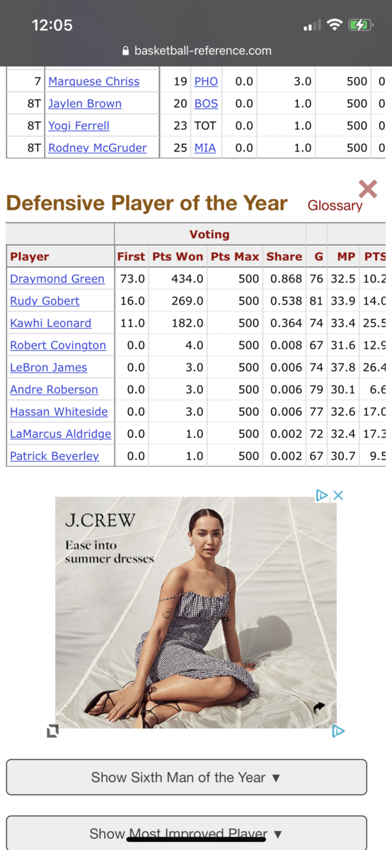 May 17, 20214 yr 6 hours ago, Bwestbrook36 said: I don't know, still don't think he should of been in. He was a great defender for 4-5 years and a good rebounder for 2 seasons. Just think you should.be great to elite for longer then that. 4x DPOY. If they had an offensive player of the year award and someone won that 4 times they’d be a shoe in. Greatest undrafted player of all time.