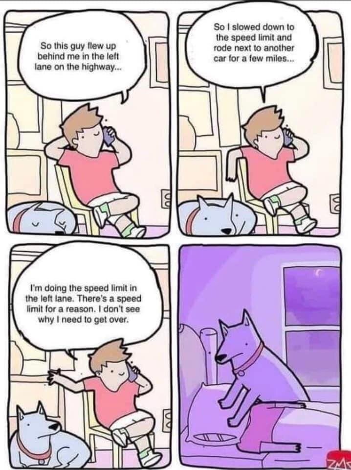 February 1, 20214 yr 8 hours ago, RPeeteRules said: Yeah if I’m in the passing lane passing some cars and someone comes up behind me I will get over as soon as possible for them. If I’m passing cars and some D weed comes flying up like he’s making a wild weasel run in Desert Storm and rides me like a truck stop hooker while I’m passing I’m going to pace the lead car in the slow lane for a good couple of miles. Like F your face I’m already breaking the law, I would have yielded at the first chance, but now because you’re an entitled piece of amphibian ish you’re going to spend a couple miles tailgating a guy that has so little left to lose he’s debating following you to where you go.