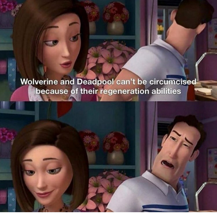 June 3, 20205 yr 2 hours ago, M.C. said: Deadpool could be circumcised because he got his regeneration ability when he was an adult, unlike Wolverine who was born with it.