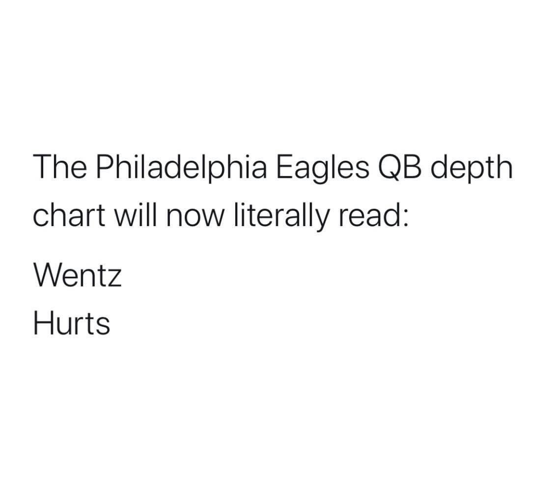 April 25, 20205 yr 33 minutes ago, 20dawk4life said: Just hope it’s not Sudfeld Hurts Wentz Wentz Hurts Sudfeld Would be acceptable.