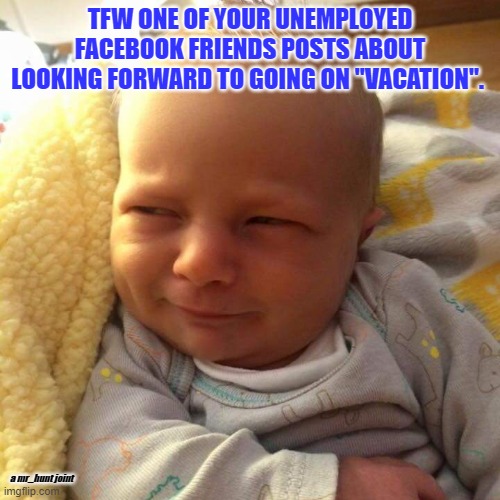 August 18, 20223 yr 39 minutes ago, mr_hunt said: this meme was inspired by one of my best friends...who hasn't had a full time job in years (decades?)...but goes on several "vacations" per year & posts all about them on fb. just once i want to reply, "vacation from what?"...but i just can't.