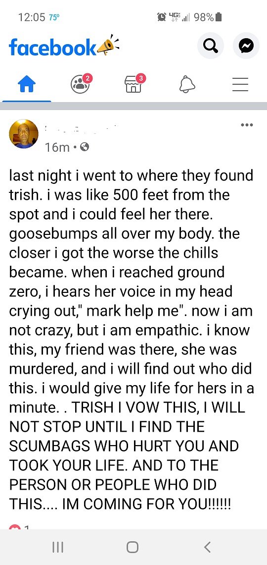 August 28, 20205 yr 9 minutes ago, mr_hunt said: facebook post from a guy who grew up in my hometown. he & his brother were really wild when they were kids..but also f'n hilarious. anyway, i have no idea what he's done with his life or where he lives....but apparently a friend of his was killed & he's been posting on fb about finding them & killing them. here's the latest: "Now I’m not crazy, but...”
