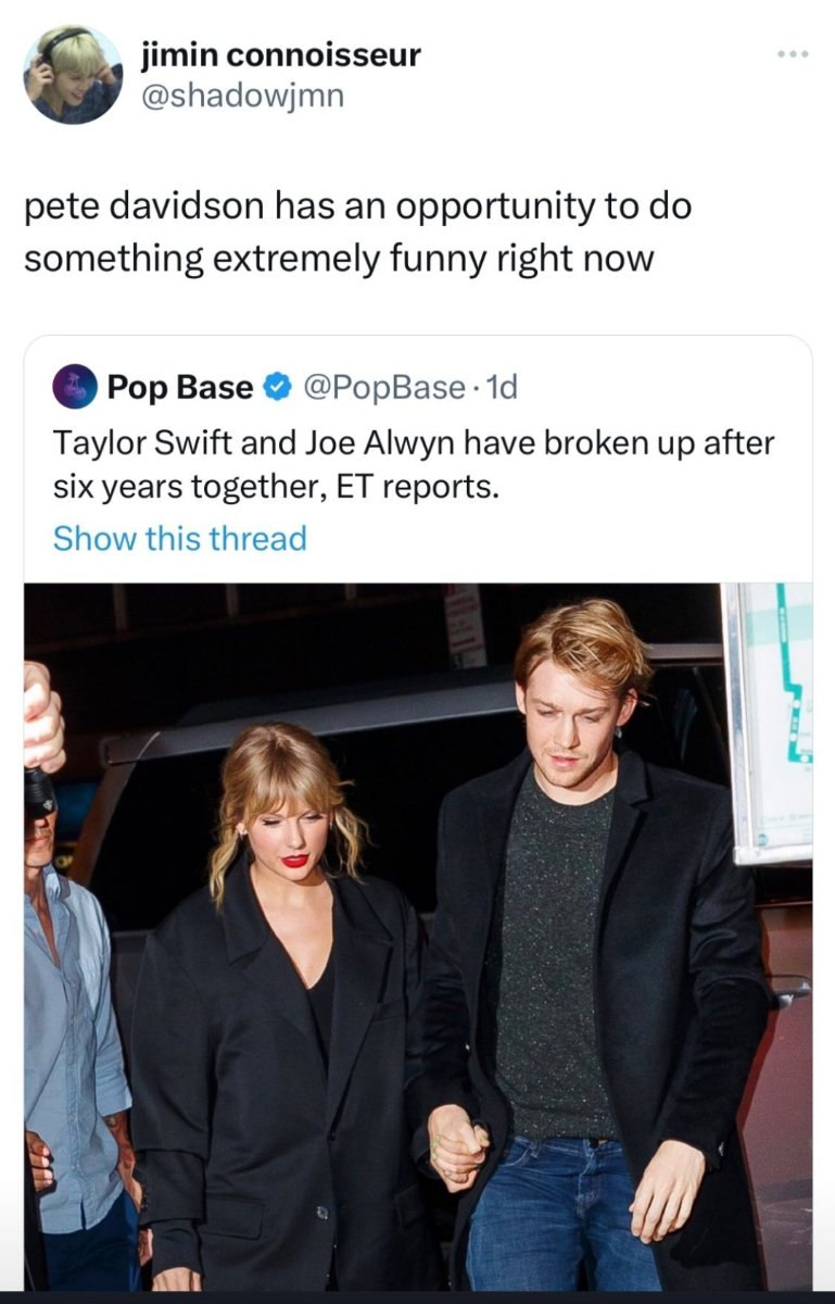 April 11, 20232 yr 51 minutes ago, Mike030270 said: I don't see what would be funny about Davidson sleeping with Swift He's the rebound king of Hollywood