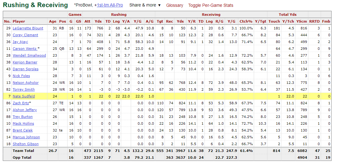 December 17, 20204 yr Nelson Agholor 38 Rec 635 Yards and 7 TDs Our top pass catcher? Feltham, 33 rec 467 yards 4 TDs Remember when JJAW lit it up in pre-season with McCown? Maybe there is more than Doug's offense that just didn't work under Wentz.
