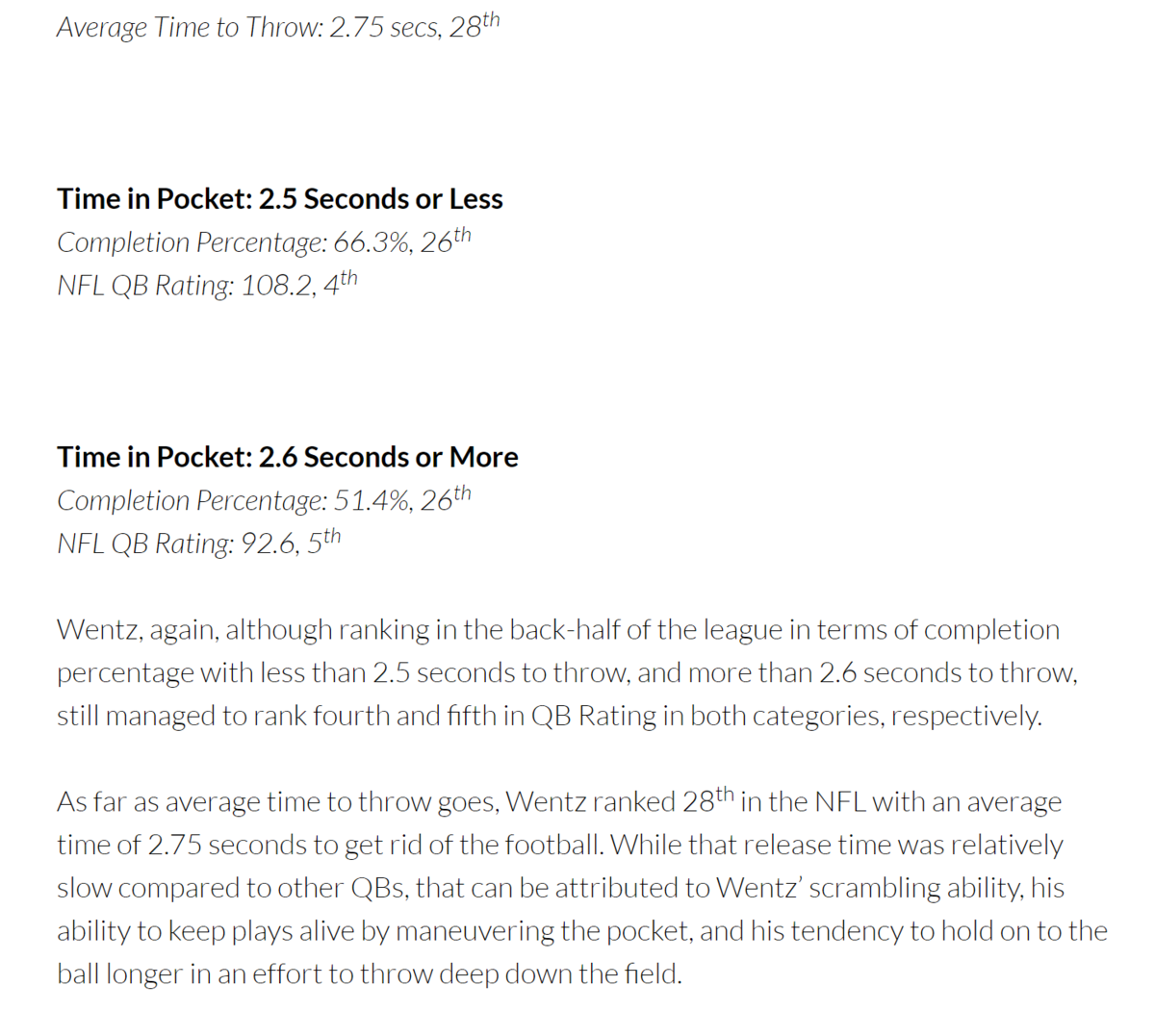 December 15, 20204 yr More evidence that I was right. Re: his great 2017 season. Take the L and move on washer. "As far as average time to throw goes, Wentz ranked 28th in the NFL with an average time of 2.75 seconds to get rid of the football. While that release time was relatively slow compared to other QBs, that can be attributed to Wentz’ scrambling ability, his ability to keep plays alive by maneuvering the pocket, and his tendency to hold on to the ball longer in an effort to throw deep down the field. " https://phillysportsnetwork.com/2018/07/05/nfl-10/