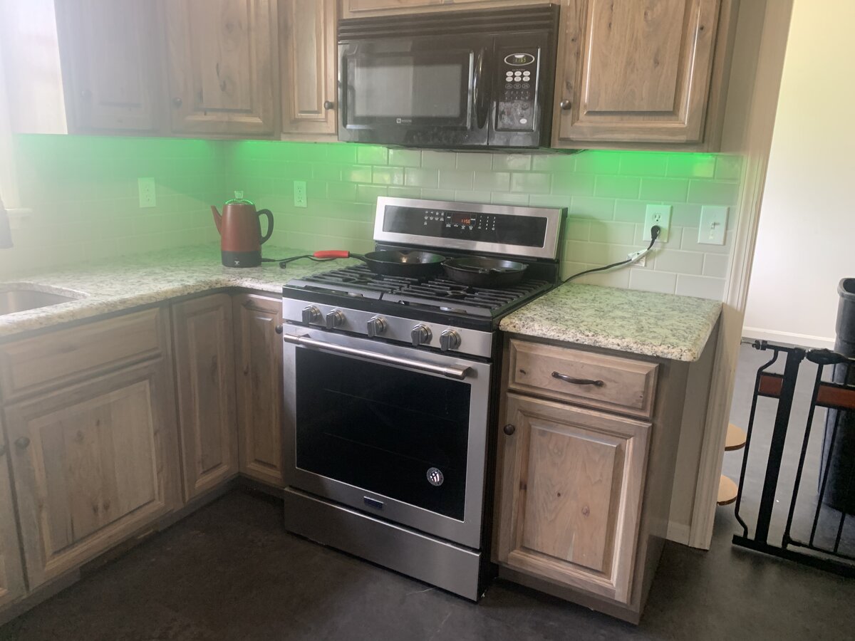 September 27, 20223 yr We had our 30 year old kitchen redone a few months ago. I had the cabinets and counters installed by professionals. I tore out the old cabinets, installed the backsplash, flooring, and under cabinet lighting. Green on games day.