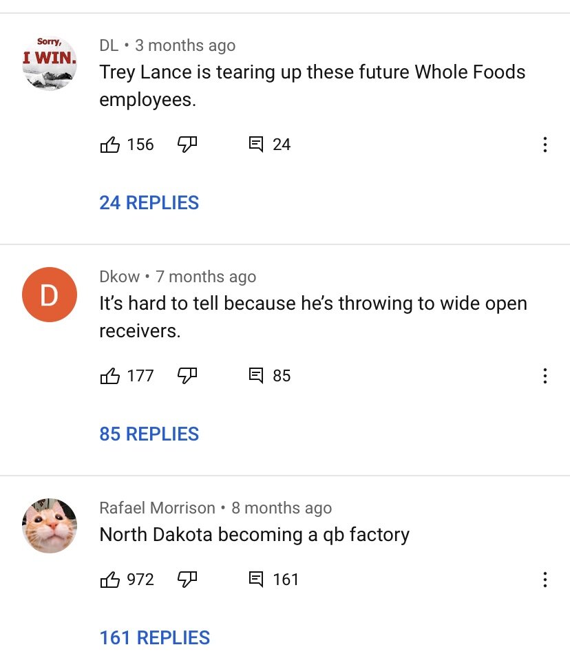 January 5, 20214 yr 8 minutes ago, Bacarty2 said: The BEST QB You’ve NEVER Heard Of 🔥🔥🔥 || NDSU QB Trey Lance Highlights ᴴᴰ - YouTube Some quality YouTube comments from that video