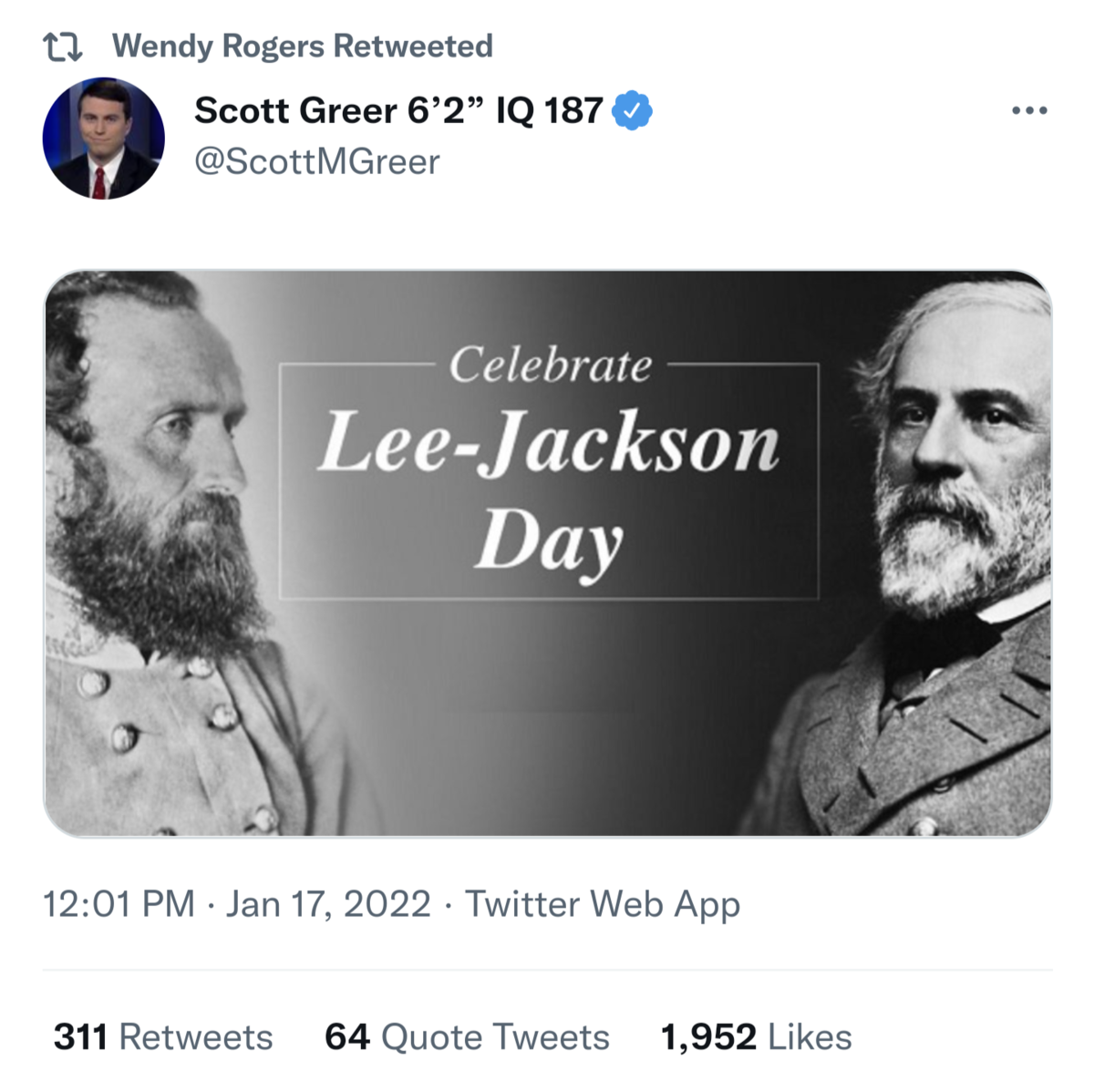 January 20, 20223 yr Did we touch on the Arizona State senator Wendy Rogers retweeting a "Celebrate Robert E Lee and Stonewall Jackson" post...on MLK day?