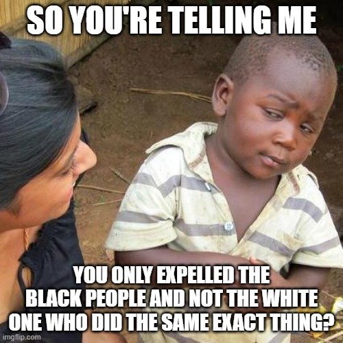 April 7, 20233 yr 2 minutes ago, Toastrel said: Child molesters are fine. Black member protesting - expelled. White protester, not expelled. Yeah but he was probably super religious (and white).