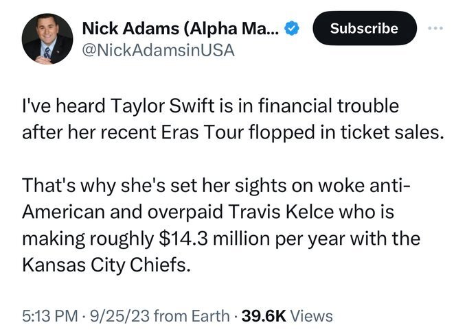 September 27, 20232 yr Just now, Toastrel said: She's after Kecle's money. What other reason could she have for dating a guy like him? https://edition.cnn.com/2023/09/25/opinions/taylor-swift-travis-kelce-relationship-toxic-de-la-cretaz/index.html The answer is in here somewhere.