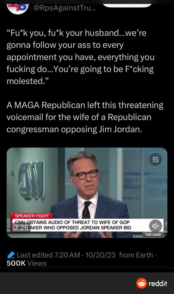October 20, 20231 yr More death threats from the cultist. Family members getting death threats. I'm going to evict you because you wont vote for a pedophile cover up artist, election denier? Seriously?
