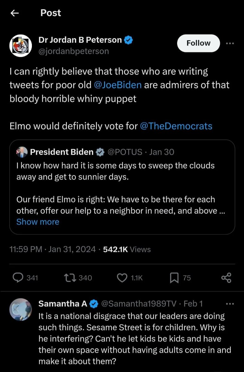 February 2, 20241 yr 38 minutes ago, Tweek said: So Elmo is evil for...checks notes...promoting people to be nice to each other and God forbid the president agree. Oh the HORROR. YET THE GQP screetches "BIDEN IS THE MOST DIVISIVE PRESIDENT EVER!" If these old curmudgeons can't find any joy from the Muppets, then they're completely out of touch. How is Biden interfering with a children's show? Really, how many children are reading about Sesame Street on their Xhitter apps?