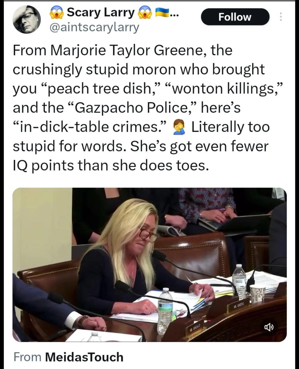 February 2, 20241 yr Since we're on the subject of EmptyG, she still has Hunter's hog on the brain - "in-dick-table" lol Marjorie Taylor Greene Accidentally Turns 'Indictable' Into Dirty Word