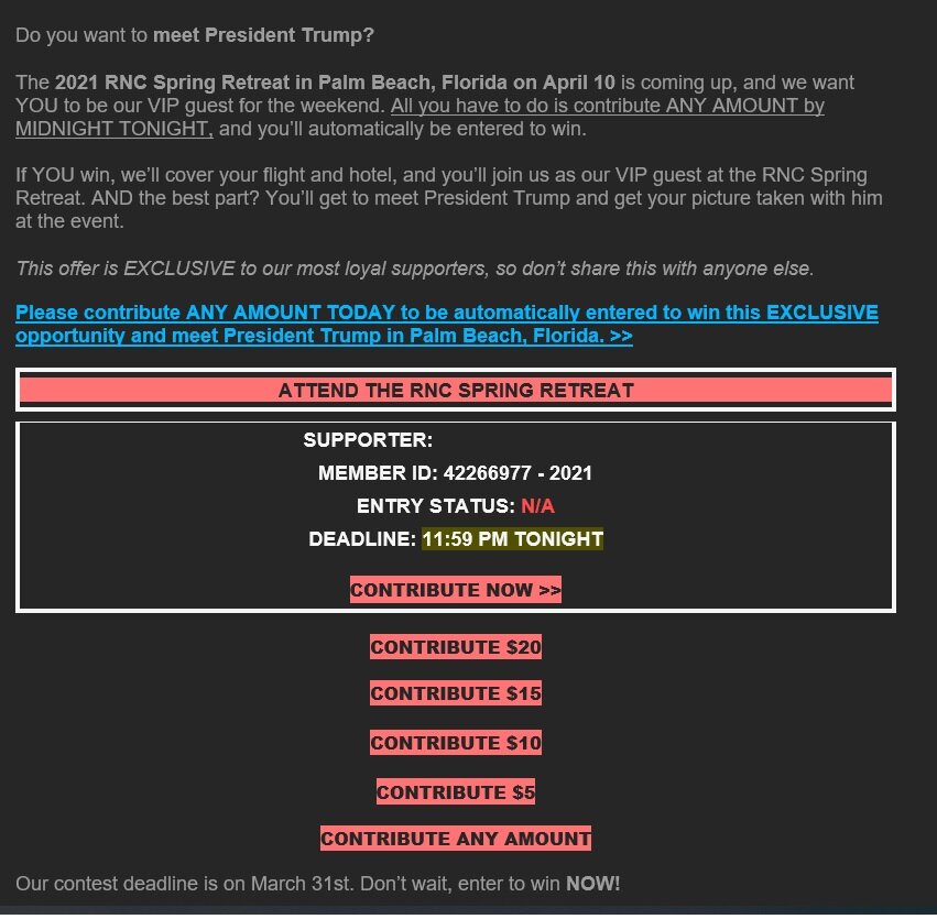 March 11, 20214 yr 16 hours ago, Toastrel said: YOU STILL HAVE TIME TO MEET THE DONALD!!!! https://secure.winred.com/rnc/spring-retreat-contest Good grift though. For one lucky "winner", they pony up the $300-$400 it costs for a flight and a hotel. In exchange, they get millions of goober dollars in donations.
