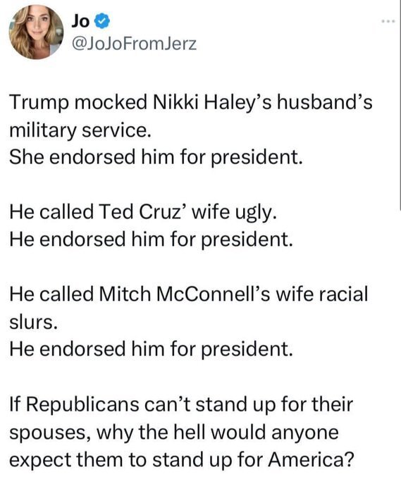 June 4, 20241 yr Well they are not Republicans. That party no longer exists. They are Trumplicans. The Party of Trump can't think for themselves, they only do what the Dictator demands they do.