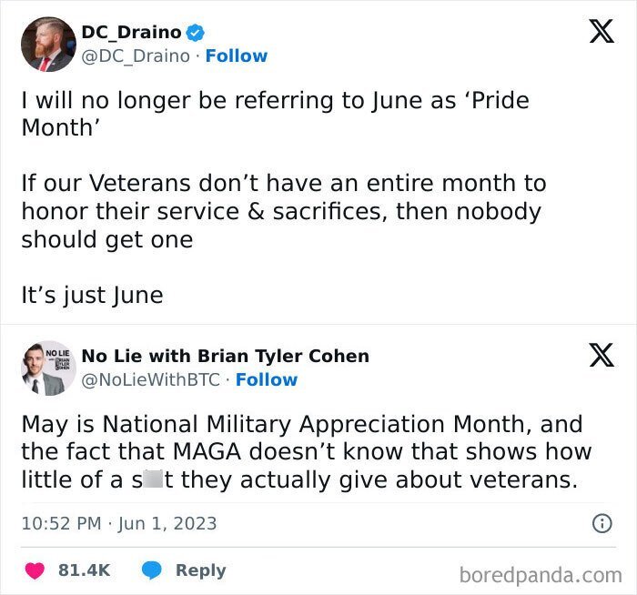 June 18, 20241 yr 50 minutes ago, Toastrel said: On top of that, there just happens to be all of these but DC Daino and MAGA cant let facts get in the way Feb. 3, 2024 – Four Chaplains Day – A Day to remember the four U.S. Army chaplains who made the ultimate sacrifice when the USAT Dorchester sank during World War II. Feb. 19, 2024 – Coast Guard Reserve Birthday March 3, 2024 – Navy Reserve Birthday March 13, 2024 - K-9 Veterans Day – The date is the official birthday of the United States K9 Corps and a day to honor their service. March 25, 2024 - Medal of Honor Day – A holiday to honor the heroism and sacrifice of Medal of Honor recipients for the United States. March 29, 2024 – Vietnam Veterans Day – A national holiday to recognize and honor Veterans who served in the military during the Vietnam War. Learn more about Vietnam Veterans Day here. April 5, 2024 – Gold Star Spouses Day – A Day dedicated to those whose spouses gave their lives while serving in the U.S. military or as a result of service-connected injuries or illness. April 14, 2024 – Air Force Reserve Birthday April 23, 2024 – Army Reserve Birthday May 1, 2024 – Silver Star Banner Day – Per Congressional resolution, it is an "Official Day to honor wounded, ill, and injured Veterans”. May 10, 2024 – Military Spouse Appreciation Day – This date recognizes the service and sacrifices of military spouses. May 13, 2024 – Children of Fallen Patriots Day – A Day to honor the children left behind by the brave men and women who gave their lives while defending our freedom. May 18, 2024 – Armed Forces Day Observed on the third Saturday every May, this is a day dedicated to paying tribute to men and women currently serving in the U.S. Armed Forces. May 27, 2024 – Memorial Day A solemn occasion to honor the men and women who died while serving in the military. Learn more about Memorial Day here. June 6, 2024 – Anniversary of the World War II Allied invasion in Normandy, France, now known as D-Day. June 14, 2024 – Flag Day – A Day to celebrate the adoption of the U.S. flag. June 14, 2024 – Army Birthday June 23, 2024 – Coast Guard Auxiliary Birthday June 27, 2024 – National PTSD Awareness Day – A Day to bring awareness about issues related to PTSD. Find resources for PTSD here. July 4, 2024 – Independence Day July 27, 2024 – Korean War Veterans Armistice Day Aug. 4, 2024 – Coast Guard Birthday Aug. 7, 2024 – Purple Heart Day – A time for Americans to pause to remember and honor the brave men and women who were either wounded on the battlefield or paid the ultimate sacrifice. Learn more about the Purple Heart. Aug. 29, 2024 – Marine Forces Reserve Birthday Sept. 11, 2024 – Patriot Day – An annual observance to remember and honor those who were injured or killed during the Sept. 11, 2001, terrorist attacks. Sept. 18, 2024 – Air Force Birthday Sept. 20, 2024 – POW/MIA Recognition Day Sept. 29, 2024 – Gold Star Mother’s and Family’s Day – A Day to honor the families of fallen Servicemembers. Oct. 13, 2024 – Navy Birthday Oct. 13, 2024 – Navy Birthday Oct. 26, 2024 – National Day of the Deployed Nov. 10, 2024 – Marine Corps Birthday Nov. 11, 2024 – Veterans Day – This is the anniversary of the signing of the armistice treaty, which ended World War I and is also a day to thank military Veterans for their service. Dec. 7, 2024 – Pearl Harbor Remembrance Day – The anniversary of the day Japan attacked Pearl Harbor, Hawaii, signaling the United States’ entrance into World War II. Learn more about Pearl Harbor Day. Dec. 13, 2024 – National Guard Birthday Dec. 20, 2024- Space Force birthday Dec. 21, 2024 – National Wreaths Across America Day Significant Military Months April – Month of the Military Child May – National Military Appreciation Month May – Month of the Military Caregiver November – Military Family Month, Warrior Care Month