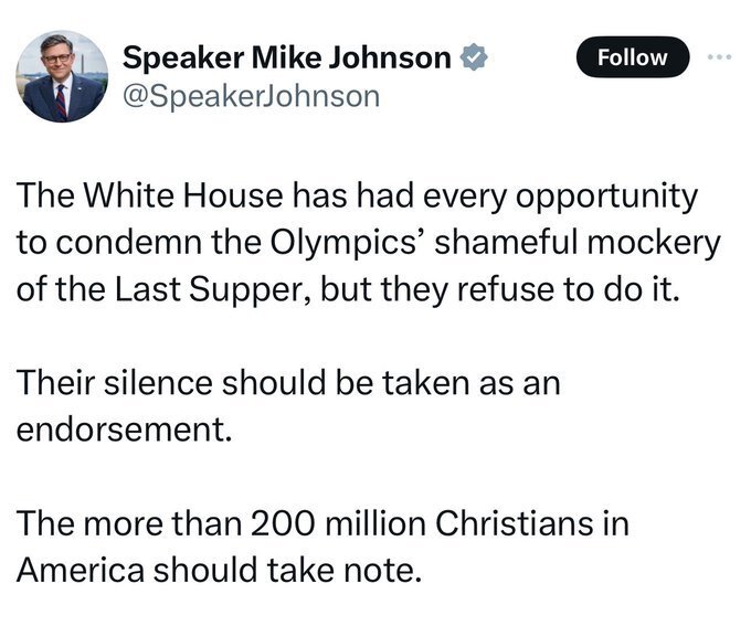 July 31, 20241 yr 4 minutes ago, Toastrel said: This skinned turd flakes. "Waaah, the French did something that makes us wet our pants. Waaaaah" The Speaker must understand the separation of church and state. POTUS represents government. He does not speak for Christianity.