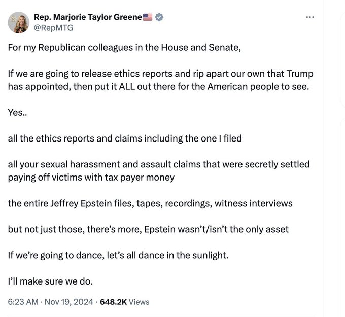 November 20, 2024Nov 20 MTG threatens to expose everybody if they release the Gaetz ethics report. Can we have this? Please!!!