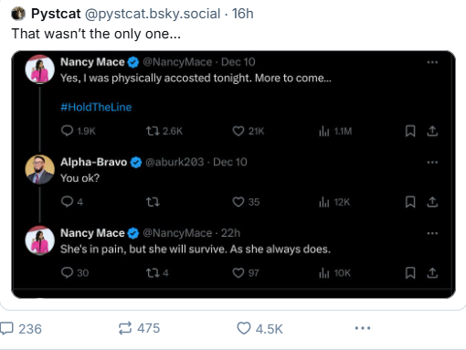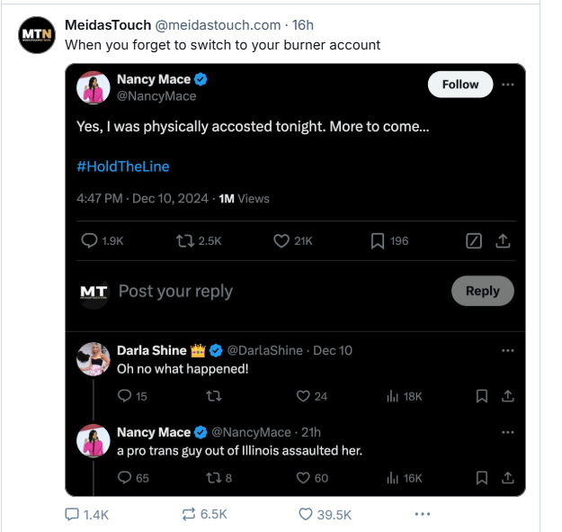 December 12, 2024Dec 12 It's possible she had an intern or staffer log into her social media account to post updates, but the fact they worked in a political wedge issue while giving an update makes me think it's still embellished or outright fabricated. We'll see if there's an actual police report.