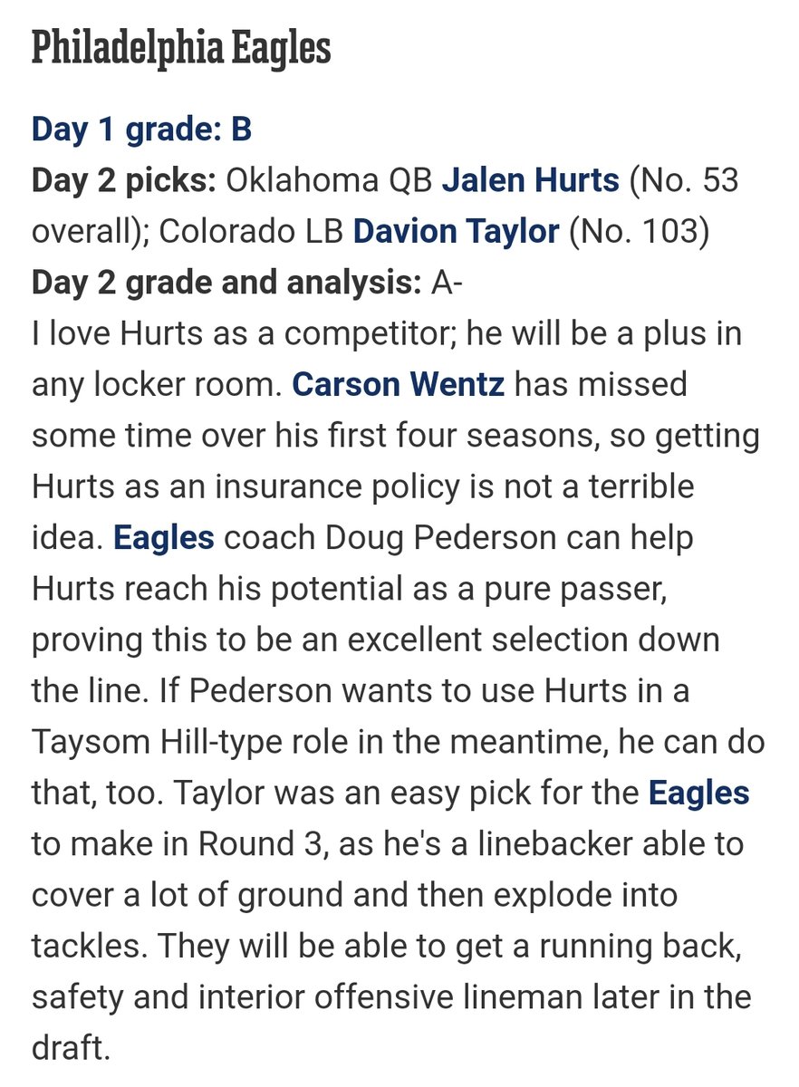 April 25, 20205 yr I think some are taking it too serious now. Wentz is not going anywhere. Hes not getting traded, not going to retire. Hurts is a insurance policy with options to try him out in other areas. Hurts does have talent, He will be cheap for 4 years and He knows his role. Do I think it might have been a bit early, yea. but I think its a simple reason why. Some are reading too much more into it when there is nothing there.