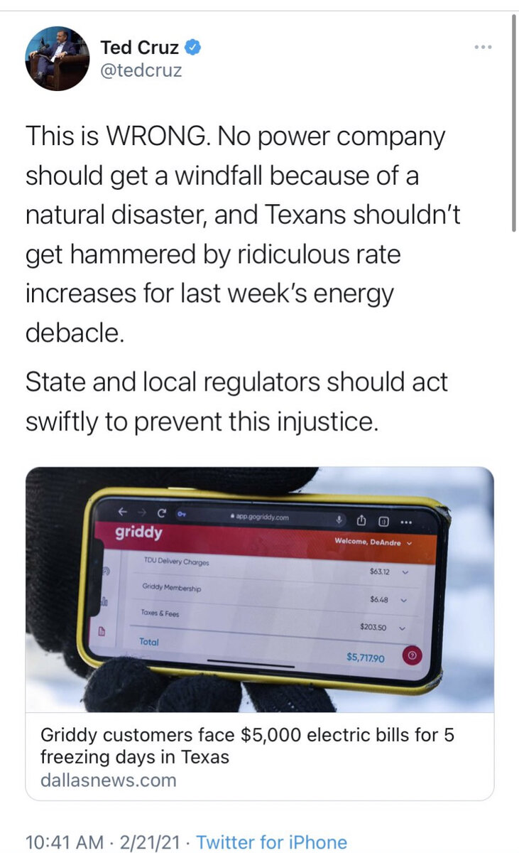 February 21, 20214 yr "Energy experts and State House Dems, among others, were warning of this (the Texas power blackout) for years.” https://www.politifact.com/factchecks/2021/feb/19/beto-orourke/beto-orourke-said-texas-was-warned-years-about-pow/ Quote A federal report following a massive power outage in Texas in February 2011 stated that recommendations to winterize the system following a 1989 cold weather event were not mandatory, and implementation lapsed. Sylvester Turner, a Texas state representative at the time, introduced a bill in 2011 which called for the Public Utility Commission to ensure the Electric Reliability Council of Texas had adequate reserve power to prevent blackout conditions. The bill failed to move forward. Known problem. Ignored for years. Quote "My savings is gone,” said Scott Willoughby, a 63-year-old Army veteran who lives on Social Security payments in a Dallas suburb. He said he had nearly emptied his savings account so that he would be able to pay the $16,752 electric bill charged to his credit card — 70 times what he usually pays for all of his utilities combined. "There’s nothing I can do about it, but it’s broken me.” Quote Katrina Tanner, a Griddy customer who lives in Nevada, Texas, said she had been charged $6,200 already this month, more than five times what she paid in all of 2020. She began using Griddy at a friend’s suggestion a couple of years ago and was pleased at the time with how simple it was to sign up.