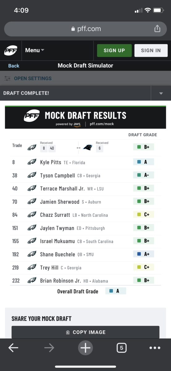 March 2, 20214 yr 2 hours ago, EazyEaglez said: I was very much against the Kyle Pitts idea. I felt like he would be our version of Evan Engram, but after hearing what people are saying, reading some mocks, and watching some highlights I’ve warmed up to the idea of taking him. Still think the Eagles have bigger needs, but if they take him I won’t be disappointed. I view him as a versatile weapon that is a mismatch nightmare... in line, in the slot, at the X. I think he’s our chance to have a Kelce or Waller. A QB’s best friend who can grab 1k receiving yards as a "TE.” This draft has second and third round WR talent...only one Kyle Pitts. I’ve said before my ideal draft is Fields sitting available and doing a small trade down with Carolina. 8 and 40 for 6. Gives us #8, two 2nds and 2 3rds. Take Pitts and with other 4 picks you grab an outside CB with size, a LB, a S and a WR. Then day 3 is a developmental QB, IOL, defensive line. Something like: