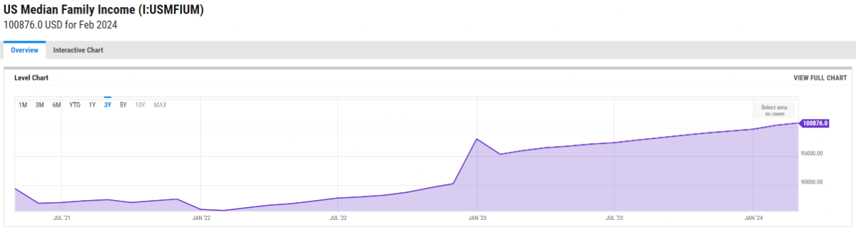 April 24, 20241 yr https://ycharts.com/indicators/us_median_family_income Honestly I'm a bit skeptical given the jump in Jan 2023, but finance guys - how accurate is ycharts on this? Inflation sucks for equities, but if you hold property or are a salary earner your wages should have also gone up.