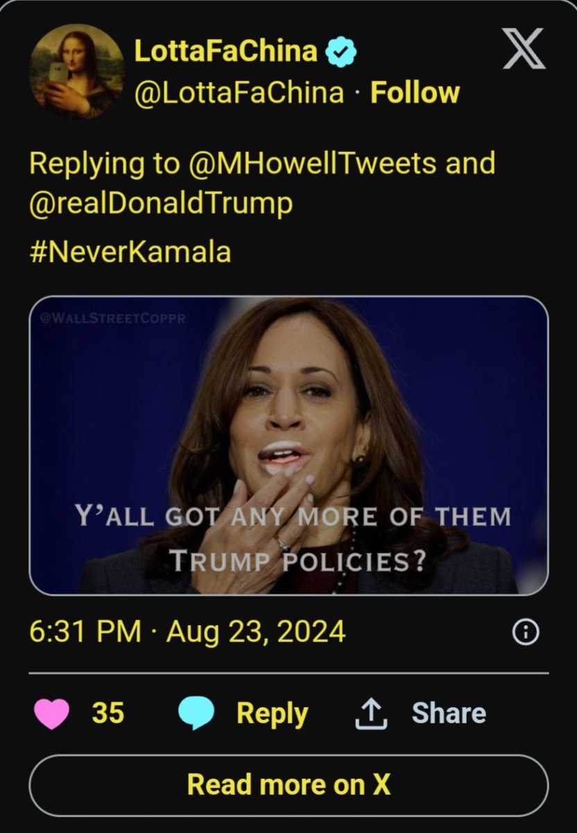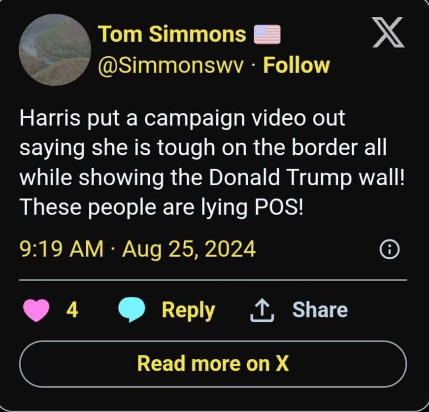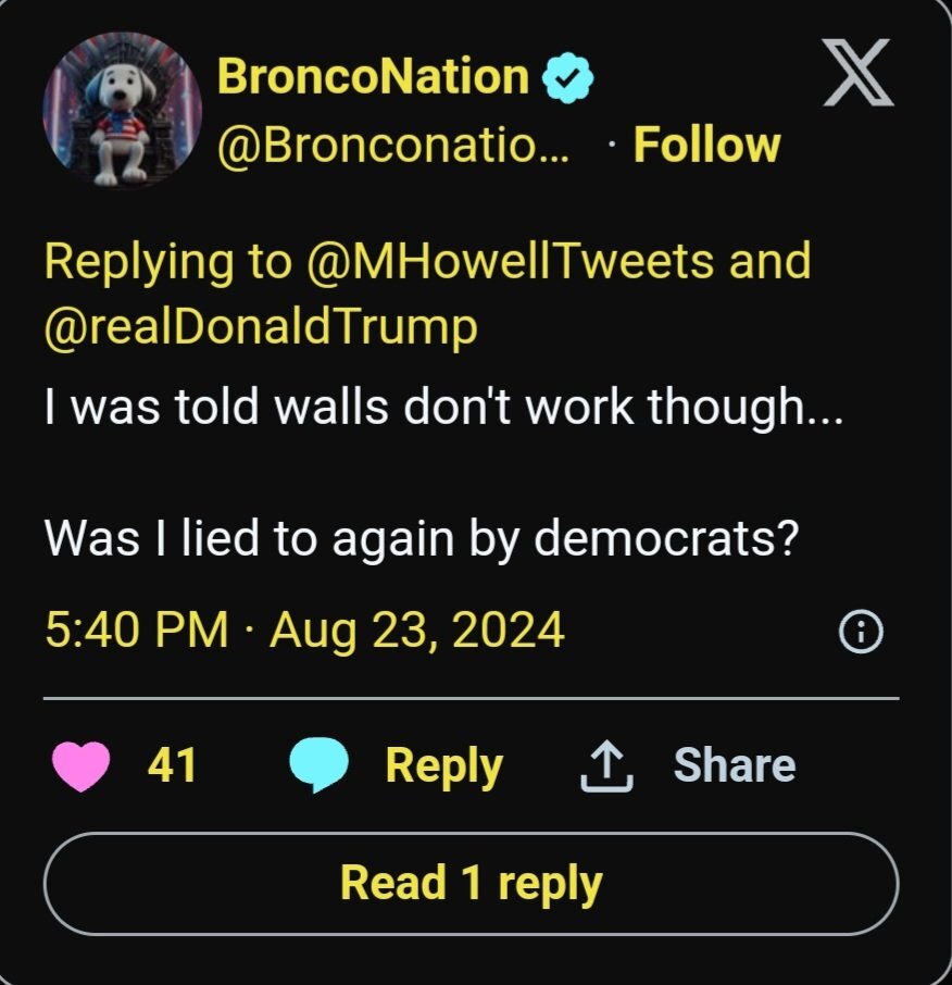 September 3, 20241 yr Despite that 50 miles of scalable, collapsing border wall I built, and the way I sunk a bipartisan border bill, I really need you to blame the current Vice President. Has anyone suggested hanging her yet? Oh, she's black, so my bigot supporters have got that covered. Cool.
