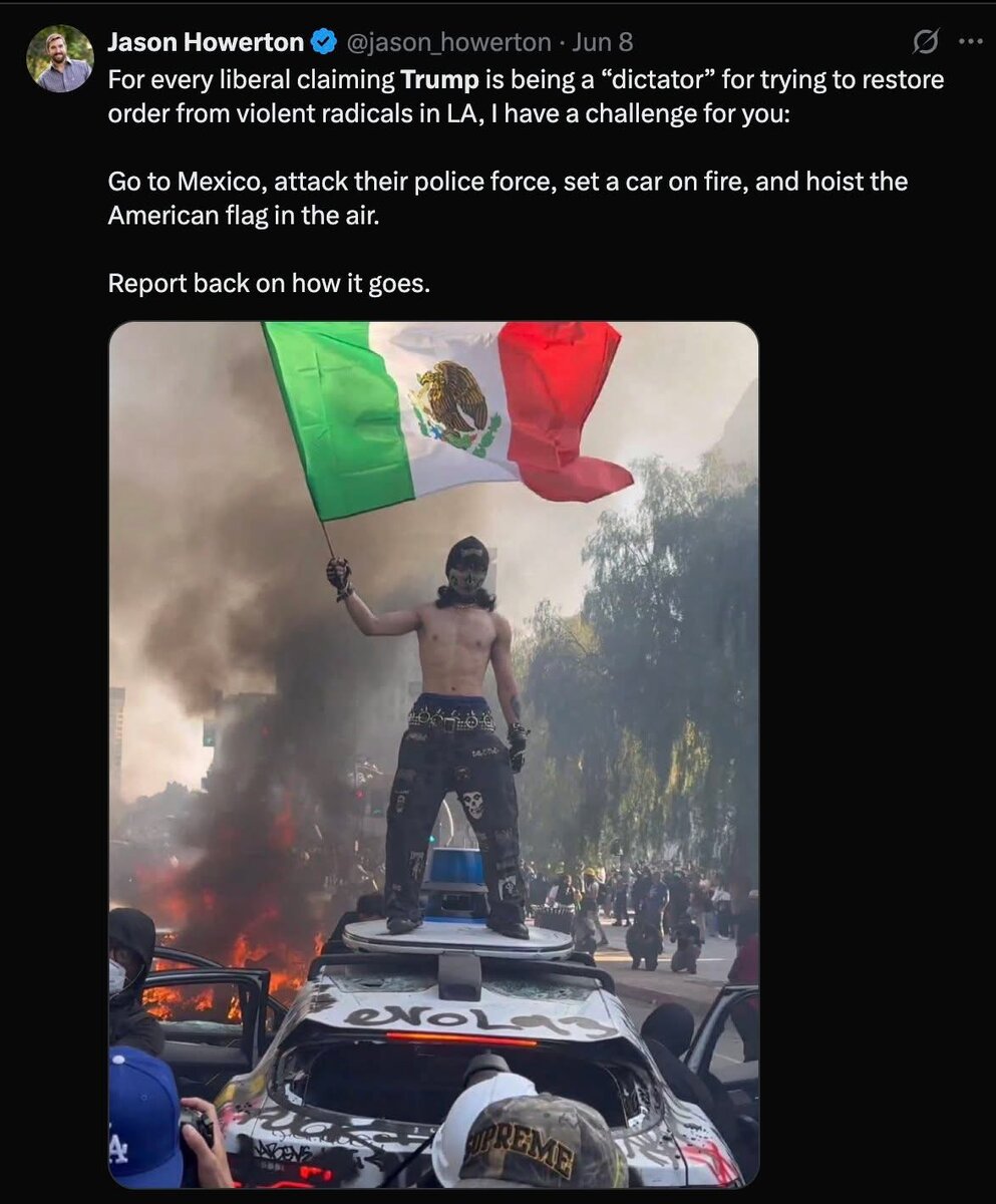 June 16Jun 16 15 hours ago, It Hurts said:the cartel does that daily (minus the american flag) and the mexican police stand by and let it happen.wow, what an awesome analogy, dope.