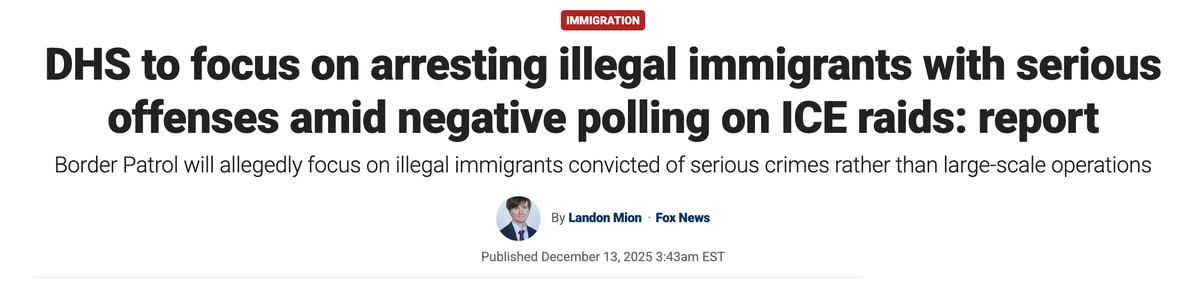 December 14, 2025Dec 14 The original headline said "mass deportations to end...". A Fox News article.What we've seen during 2025 is NOT what the majority of Trump voters thought they were signing up for. The immigrants who have committed serious crimes, yes. The gardener with three kids whose lived a clean life in the US for 20 years, no.The MAGA Trump peak is behind us now and the tables are slowly turning. We saw the same sort of turn with regard to stupid woke sheet a few years back. Sanity will start to prevail. The question is what desperate moves will be made by Miller/Bannon, etc. and if they will succeed or not. Would they dare try to cancel the mid term elections due to some setup, e.g. war with Venezuela connected to 20M immigrants already in the US?