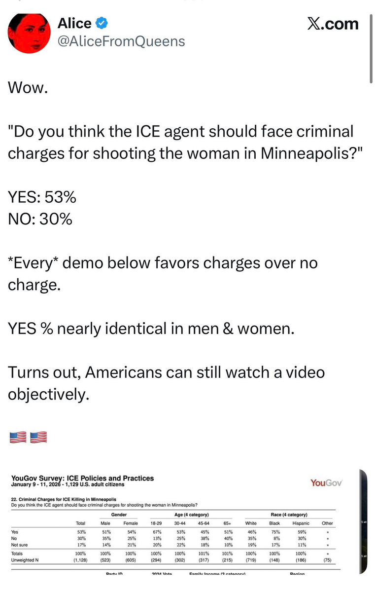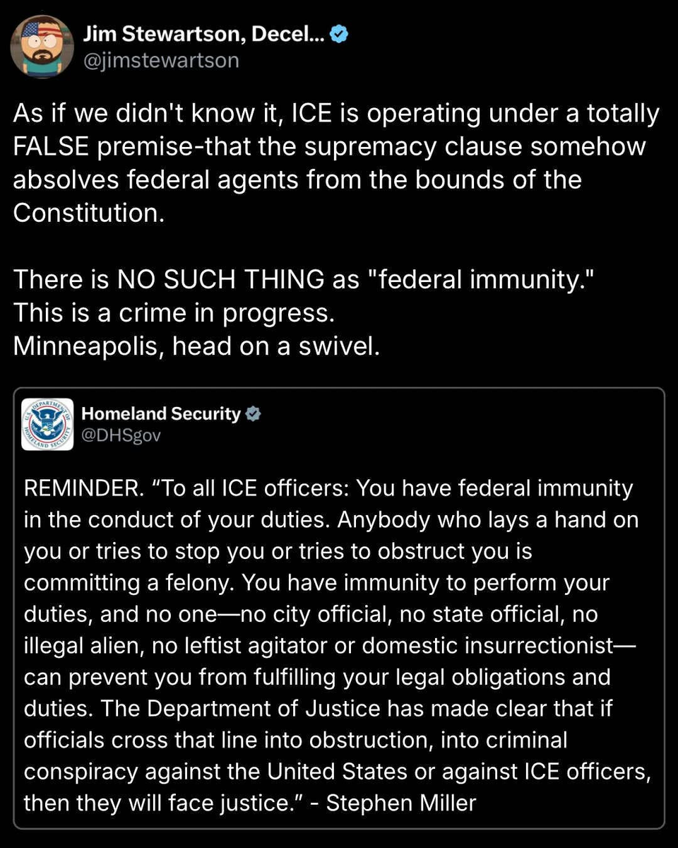 January 16Jan 16 9 minutes ago, toolg said:Stephen Miller is telling ICE officers to break the law.They are pushing hard now. Miller absolutely wants to go Insurrection Act and then Marshall Law down the road. Over the next months we shall see if Trump wants to go that route despite it being very unpopular generally to most citizens.