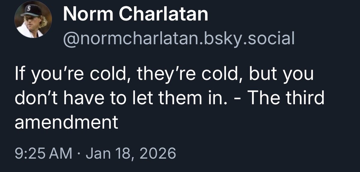 January 18Jan 18 37 minutes ago, Talkingbirds said:So Minnesota will have Ice/DHS, military troops, national guard and local and state police. Nothing to see here.It's all those the immigrants' fault for illegally crossing over his border wall into Minnesota.