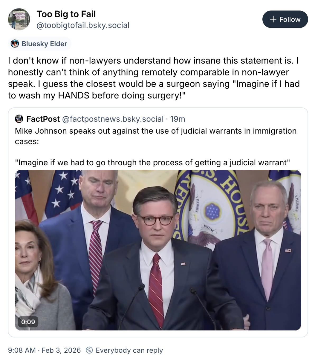 February 4Feb 4 The Trump administration is doing so much illegal the judges literally cannot keep up. This is a feature, not a bug.