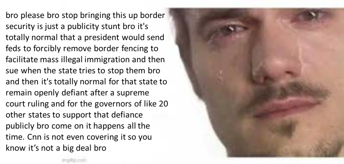 January 26, 20241 yr 2 minutes ago, Kz! said: He doesn't have to play along. He forcibly tried to get Texas to allow mass illegal immigration, and Texas called him a ****. Now he has to sit there impotently and do nothing because any further action would just magnify the incredibly awful optics of the situation. The SC ruled. Texas ignored it. Now a bunch of National Guardsman are going to stare at a few miles of razor wire for a few days. Compelling!