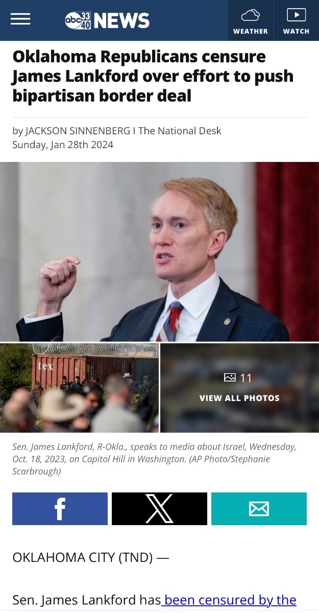 January 30, 20241 yr 6 minutes ago, MidMoFo said: Can’t talk about it… no one is allowed to talk about it. https://abc3340.com/amp/news/nation-world/oklahoma-republicans-censure-james-lankford-over-effort-to-push-bipartisan-border-deal-gop-ukraine-israel-national-security-emergency-powers-asylum-parole-illegal-crossing-homeland-security-president-joe-biden-donald-trump How dare he negotiate with Dems. We didn't elect him to work with Dems on leglislation.