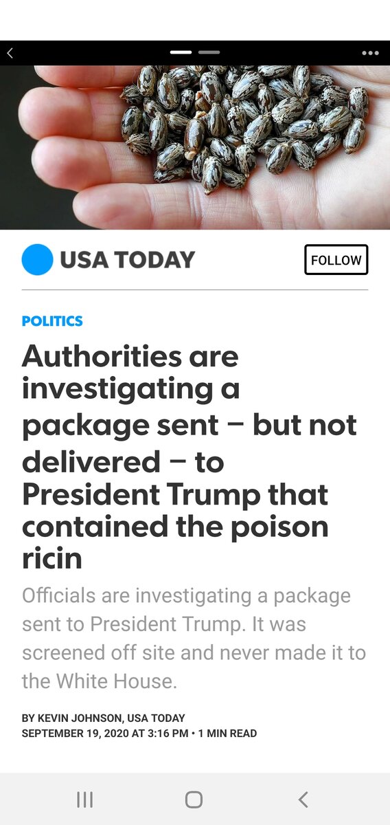 September 20, 20205 yr https://www.usatoday.com/story/news/politics/2020/09/19/trump-ricin-package-white-house-poison/5840290002/